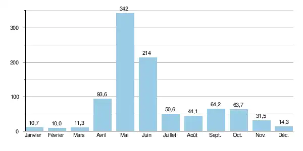 Le débit moyen mensuel observé en février constitue à peine 3 % du débit moyen du mois de mai (342 m3/s), ce qui souligne l'amplitude très importante des variations saisonnières. Ces écarts peuvent être plus élevés encore selon les années. Sur la durée d'observation de 32 ans, le débit mensuel minimal a été de 3,26 m3/s (en ), tandis que le débit mensuel maximal s'élevait à 523 m3/s en .