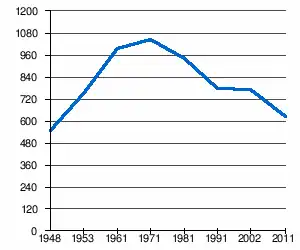 En 2011, l'âge moyen de la population était de 43,4 ans, 40,7 ans pour les hommes et 46 ans pour les femmes[6].