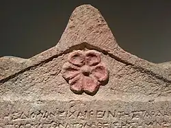 La stèle est surmontée de trois acrotères, un au milieu et un de chaque côté. Son tympan est décoré d'une rosette. L'intérieur des lettres et la rosette étaient peintes rouges[1].