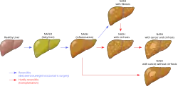 Le stade suivant est l'hépatite stéatosique ou stéatohépatite avec inflammation du foie. La stéatohépatite non alcoolique est caractérisée par deux lésions : l'inflammation et le ballooning (ballonisation), à savoir le gonflement des hépatocytes. L'évolution vers la cirrhose est possible mais rare. Toutefois, l'incidence importante de la stéatohépatite non alcoolique fait qu'il s'agit d'une cause non exceptionnelle de cirrhose[10], avec ses complications, comme l'hépatocarcinome. Spécificité de la NASH, le carcinome hépatocellulaire peut se développer avant d'avoir atteint le stade de la cirrhose, ce que l'on ne retrouve pas dans l'hépatite alcoolique par exemple[13].