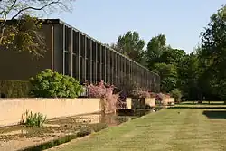 Une vue du jardin d'eau le long du côté ouest du site, vers le petit pont qui faisait partie de la séquence d'entrée d'origine.- Une vue du logement côté ouest et du jardin d'eau.