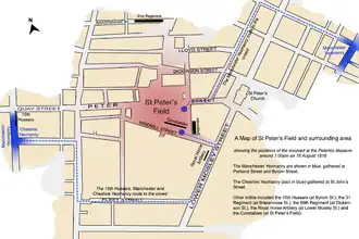 La zone de St Peter's Square, alors connu comme St Peter's Field, est le site du Massacre de Peterloo en 1819. Le nom provient de celui de l'église St Peter's bâtie en 1788-1794 à l'endroit où se trouvent les jardins. L'église donne son nom aussi à Peter Street. L'église était construite dans un style néoclassique par l'architecte James Wyatt et était réputée pour sa musique religieuse. L'église est démolie en 1907, Une croix en pierre posée à son emplacement en 1908.