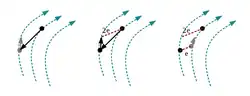 Cela dit, le fluide suit un parcours curviligne et la simple utilisation de la vélocité ne suffit pas pour trouver précisément l'ancienne position de la particule. Il peut être effectué des corrections afin d'améliorer la précision. Il y a le Runge-Kutta, le MacCormack[5] et le BFECC[6] (Back and Forth Error Compensation and Correction).
