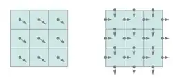 Dans une staggered-grid[3] les variables scalaires (comme la pression) sont stockées aux centre des cellules, tandis que les vélocités sont localisées sur les bords (ou faces) de la cellule.