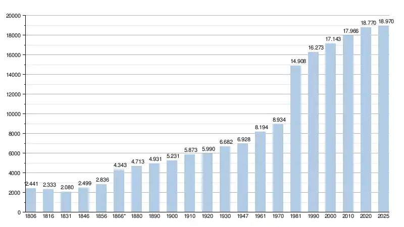 - Source : DGS - Remarque: 1806 jusqu'à 1981=recensement; depuis 1990=nombre d'habitants chaque 1er janvier[4]