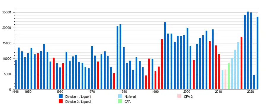 - ↑ « Historique affluences spectateurs Strasbourg », sur stades-spectateurs.com (consulté le )