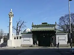 L'entrée est surmontée d'un auvent en fer forgé en forte saillie peint en couleur vert pomme, une caractéristique commune à toutes les stations de la Stadtbahn réalisées par Otto Wagner[15]. Cet auvent est porté par deux hautes colonnes en fer forgé ajouré s'élançant d'un socle de pierre calcaire discrètement relié aux soubassements latéraux. Ornées à leur sommet d'une couronne de laurier, ces colonnes portent par de fins corbeaux en fer forgé l'auvent vert sous lequel s'abrite une frise de feuilles de laurier et de roses. En retrait de l'auvent, orné de palmettes, on aperçoit le corps central de la station, de forme carrée, orné sur chaque face d'un entablement en maçonnerie composé d'une architrave ornée d'un large cartouche aveugle flanqué de deux petits cartouches sculptés, d'une frise de perles et d'une petite corniche. Ce corps central est marqué à chaque angle d'une cheminée.