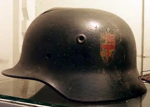 Le métal utilisé pour la fabrication des casques provient de Suède, le fer y étant l'un des meilleurs d'Europe. Le casque est alors généralement pourvu de deux insignes identifiant l’arme, dont un sur les couleurs nationales ainsi que: l’aigle d’argent surmontant la croix gammée pour la Heer, l’aigle d’or pour la Kriegsmarine, un aigle aux ailes déployées pour la Luftwaffe, et les runes pour la SS. La couleur du casque varie de gris à vert, en passant par le bleu pour la Luftwaffe, suivant les armes et les contraintes du camouflage (en 1940 c'est de la peinture mate et non plus brillante qui est appliquée sur les casques produits)[11].