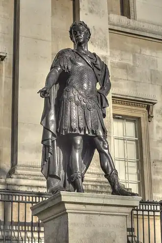 - ↑ James Peller Malcolm, Londinium Redivivum : Or, An Ancient History and Modern Description of London, vol. 4, Londres, J. Nichols, (OCLC 5827713), p. 280 En anglais : There is but one fault in the figure, and that is the attitude. The King seems to point with a baton at the earth, to which his eyes are directed; but why? Surely this is an egregious error. However, perhaps the artist may have been commanded to model the statue thus; and if not, his mistake is more than counter-balanced by the beautiful turns of the muscles, the excellence of the features, and the true folds of the drapery