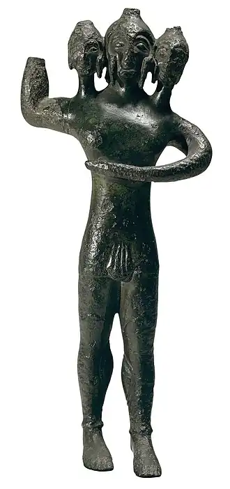 Il est possible de reconnaître dans un dieu triple un Mercure, à la manière ou l'on voit trois bustes de Mercure sur des monnaies rèmes. L’idée d’un personnage caractérisé par un triple corps ou à trois têtes dans les conceptions mythologiques existe dans presque tous les peuples de l’antiquité. L'un des plus célèbres dans ce genre est Géryon, roi de l’Ibère, souvent chanté par les poètes. Sur les monuments les plus anciens ce sont trois guerriers, armés et casquées, placés les uns à côté des autres sans que les corps soit rattachés entre eux. Sur le coffre de Cyspelus, Géryon est représenté en trois guerriers distincts. Les différents vases peints antiques représentent également Géryon de manière distinct. C'est ensuite que les trois têtes sont ramenées sur un seul corps. Ainsi, diverses manières de représentés le géant existent. On retrouve le mythe d'un personnage à trois têtes sous plusieurs formes très différentes de l'Ouest à l'Est de l'Occident. La place d'un cerbère, du bouvier de Géryon mais aussi d'un dragon à sept têtes et la présence d'Hadès dans le mythe apparaissent parfois. La statuette étrusque représente Géryon, cependant il semble ne pas être considéré par les étrusques comme un géant tyrannique mais plus comme une divinité. Tibère parle de lui comme un oracle pour l'Italie du Nord et comme un dieu à Chypre. Il serait alors adoré en tant que divinité en Étrurie, il y est en tout cas connu sous le nom de Cerun nom qui désigne un bouvier infernal, on le voit aussi assistant Hadès sur une fresque funéraire. On peut alors croire que Géryon est une divinité rattachée à l’élevage bovin chez les étrusques. Le musée des beaux-arts a longtemps désigné la statuette par « guerrier tricéphale » et « divinité à trois têtes », l'appellation de « triple Géryon » est récente.
