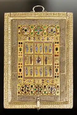 Au centre du couvercle se trouvent neuf plaques d’émaux, entourées d’une bande décorative. La rangée centrale des images est une déesis : au centre est un christ trônant (Christ pantocrator), à gauche Jean l'Évangéliste accompagné de l'archange Gabriel, à droite Marie accompagnée de l'archange Michel. Les anges portent des habits de la cour byzantine, Marie et Jean sont vêtus de pourpre impériale. Dans les rangées au-dessus et en dessous, des saints par paires. Les registres du haut et du bas présentent les douze apôtres, groupés par deux. Les plaques centrales sont entourées d'un bandeau ornemental constellé de pierres où sont enchâssés des médaillons de huit saints en buste. Deux plaques décorées de trois rosettes figurées par des petits grenats et constellées de pierres se trouvent au-dessus et en dessous de ce cadre. Le tout est entouré de dix bandes rectangulaires[3]. Le dos du couvercle montre une croix posée sur un socle, en argent doré repoussé. Au pied de l'arbre pousse une acanthe.
