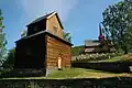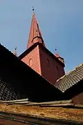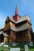 On remarquera que la flèche de cette stavkirke est peinte en rouge ainsi que la présence d'un beffroi, comme dans bon nombre de stavkirker.