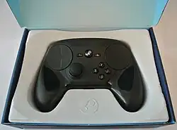 Lancée en novembre 2015[44], la manette comprend deux trackpads haute résolution, remplaçant les traditionnels sticks analogiques des manettes de consoles actuelles. La manette possède également pas moins de 17 boutons, dont 11 en face : 3 en bas correspondant à Start, Select et Espace, 4 au-dessus en forme de carré et 4 autres aux coins de ces carrés. Sur le sommet, deux boutons de tranche correspondant à LB et RB, et deux gâchettes arrières ressemblant à LT et RT. Autres nouveautés par rapport aux contrôleurs concurrents, la manette propose deux touches longilignes et verticales sur l'arrière des poignées pour accueillir l'annulaire et l'auriculaire. De plus, elle est embarque des capteurs gyroscopique et accéléromètre. Chris Kohler du magazine Wired a pu tester le Steam Controller en jouant à Civilization V lors d'un événement presse chez Valve, et note que lorsqu'il utilise le pavé tactile pour déplacer le curseur de la souris, les électro-aimants de la manette créent un retour audio et tactile comme s'il utilisait un trackball[45]. Bien que la manette soit conçue spécifiquement pour les Steam Machine, elle peut également être utilisée avec Steam sur des PC existants[46].
