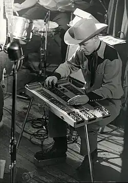 Différents types de steel guitars : résonator (à g.), lap steel (à dr), pedal steel (au fond) | |