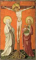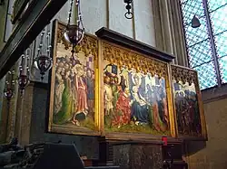 Retable des quatre pères latins de l'Église, volet de gauche[29] Face intérieure, Saints Matthieu, Catherine d'Alexandrie et Jean l'Évangéliste Face extérieure, Saint Jérôme, une martyre et saint Grégoire le Grand avec un donateur[30] |