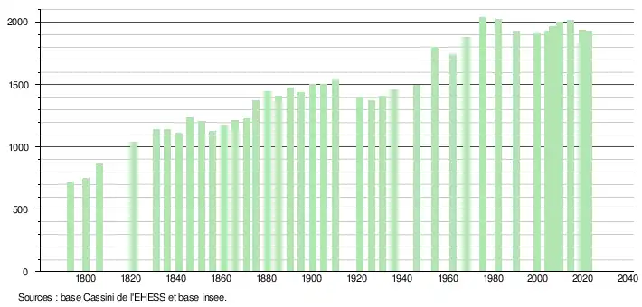 L'évolution du nombre d'habitants est connue à travers les recensements de la population effectués dans la commune depuis 1793. Pour les communes de moins de 10 000 habitants, une enquête de recensement portant sur toute la population est réalisée tous les cinq ans, les populations de référence des années intermédiaires étant quant à elles estimées par interpolation ou extrapolation[28]. Pour la commune, le premier recensement exhaustif entrant dans le cadre du nouveau dispositif a été réalisé en 2004[29].
