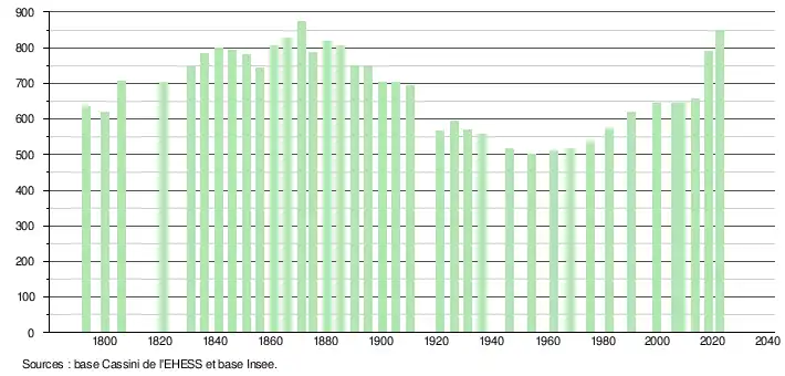 L'évolution du nombre d'habitants est connue à travers les recensements de la population effectués dans la commune depuis 1793. Pour les communes de moins de 10 000 habitants, une enquête de recensement portant sur toute la population est réalisée tous les cinq ans, les populations de référence des années intermédiaires étant quant à elles estimées par interpolation ou extrapolation[18]. Pour la commune, le premier recensement exhaustif entrant dans le cadre du nouveau dispositif a été réalisé en 2008[19].
