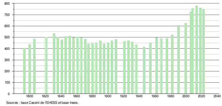 L'évolution du nombre d'habitants est connue à travers les recensements de la population effectués dans la commune depuis 1793. Pour les communes de moins de 10 000 habitants, une enquête de recensement portant sur toute la population est réalisée tous les cinq ans, les populations de référence des années intermédiaires étant quant à elles estimées par interpolation ou extrapolation[19]. Pour la commune, le premier recensement exhaustif entrant dans le cadre du nouveau dispositif a été réalisé en 2008[20].