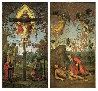 Sur le recto est peinte la Crucifixion surmontée d'un trône de grâce avec les saints Roch et Sébastien ; sur le verso, la Création d'Ève.