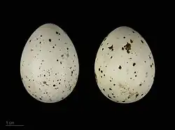 Mâle et femelle choisissent et défendent ensemble le site de nidification. Pendant le processus de sélection du nid, le mâle continue à nourrir la femelle. L’accouplement a lieu peu après[14]. La construction du nid consiste à gratter le sol afin de former une simple dépression qui est laissée nue ou parfois recouverte avec des brins d’herbe ou d’autres matériaux semblables. La femelle pond de un à trois œufs (généralement deux)[2]. Les œufs gris, blancs, brunâtres, beiges ou verdâtres sont naturellement tachetés de brun (davantage que ceux de la Sterne pierregarin), ce qui leur sert de camouflage[2]. Leur taille moyenne est de 40 × 29 mm (valeurs extrêmes : 35,4-47 × 27,2-33,1 mm) pour une masse fraîche[Note 2] (avant incubation) d'environ 19 g[15]. L'incubation est assurée par le mâle et la femelle. Cette dernière assure la plus grande part dans la journée et couve aussi la nuit. Les jeunes (indiscernables de ceux de la Sterne pierregarin) éclosent de 22 à 27 jours après la ponte et quittent le nid de 21 à 24 jours après l’éclosion[2]. Si les parents sont dérangés et donc quittent le nid fréquemment, la période d’incubation peut s'étendre jusqu’à 34 jours[11].