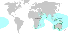 Est de l'océan Indien, Australie et Ouest de l'océan Pacifique | Comme T. b.bergii, avec queue, croupion et dos concolores. Plus pâles en Australie. | Plus de 500 000 individus en Australie[19] |