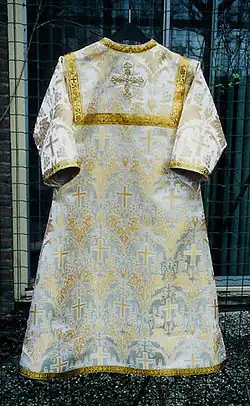 Les diacres, sous-diacres (hypodiacres), lecteurs et chantres revêtent par-dessus leur soutane un sticharion long et droit aux manches larges et libres, aux bas des côtés parfois ouverts et fermés par des boutons ou rubans. Sa forme ressemble à la dalmatique utilisée dans le rite occidental. Normalement une croix est brodée ou appliquée en haut du dos au milieu des épaules. La couleur du tissu s'adapte aux temps liturgiques.
