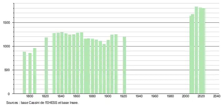L'évolution du nombre d'habitants est connue à travers les recensements de la population effectués dans la commune depuis 1793. Pour les communes de moins de 10 000 habitants, une enquête de recensement portant sur toute la population est réalisée tous les cinq ans, les populations de référence des années intermédiaires étant quant à elles estimées par interpolation ou extrapolation[19]. Pour la commune, le premier recensement exhaustif entrant dans le cadre du nouveau dispositif a été réalisé en 2008[20].