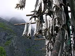 Stockfisch séchant sur des claies de bois.