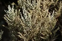 C'est une plante hétérophylle. Le premier type de feuillage, composé de petites aiguilles verdâtres, écartées de la tige, caractérise la phase juvénile et subsiste sur les individus qui se développent en forêt. Les feuilles du second type, appliquées contre la tige, ressemblent plus à de petites écailles. Leur base est enveloppée d'un enchevêtrement de poils blancs, ce qui donne alors à la plante un aspect général blanchâtre[1]. Cette deuxième morphologie est typique des individus des landes d'altitude qui se développent en pleine lumière.