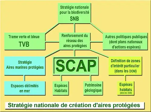 En 2004, la France a publié sa première stratégie nationale pour la biodiversité (SNB) en tant que telle, définie avec des plans sectoriels devant s'achever en 2008, suivis d'une seconde programmation 2009-2010 de plans d'action. En 2011, cette stratégie a été révisée[1], en reconnaissant le constat d'échec de la précédente (comme ailleurs dans le monde) et en visant notamment à intégrer certains apports du Grenelle de l'Environnement et de la loi Grenelle I qui prévoit que « la SNDD et la SNB sont élaborées par l'État en cohérence avec la stratégie européenne de développement durable et en concertation avec les représentants des élus nationaux et locaux, des employeurs, des salariés et de la société civile […] »[2]. Des appels à projets thématiques ont été lancés sur les thèmes suivants : « A- Rétablissement des continuités écologiques des infrastructures de transport existantes, B- Restauration de milieux remarquables ou sensibles, C- Lutte contre les espèces exotiques envahissantes terrestres et marines dans les départements et collectivités d'outre-mer, D- Conservation et utilisation durable d’espèces végétales indigènes pour développer des filières locales, E- Projets innovants dans le domaine de l’ingénierie écologique, F- Infrastructures agroécologiques, G- Trames vertes et bleues urbaines » (les deux derniers étant ouverts jusqu'au ).