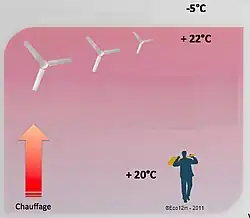 - à la consommation d’énergie de chauffage nécessaire pour obtenir la température de consigne. La surchauffe de l'atmosphère haute (inutile) est alors une source de déperdition proportionnelle à l'écart de température (involontaire).