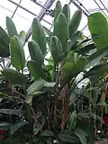 Elle adopte un port arborescent sur un tronc qui peut atteindre six mètres de haut d'où surgissent des feuilles gris-vert disposées en éventail, comme pour l'arbre du voyageur, et qui peuvent mesurer près de deux mètres de long.