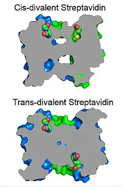 Une streptavidine avec exactement deux sites de liaison à la biotine peut être produite en mélangeant des sous-unités avec et sans site de liaison fonctionnel puis par purification par chromatographie à échange d'ions. Les sites fonctionnels ont la même stabilité de liaison à la biotine que la streptavidine sauvage. Les streptavidines divalentes présentant deux sites de liaison fonctionnels réunis (cis-divalente) ou séparés (trans-divalente) peuvent être purifiées séparément[15].