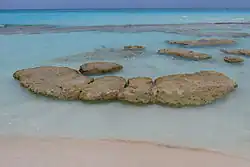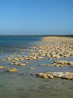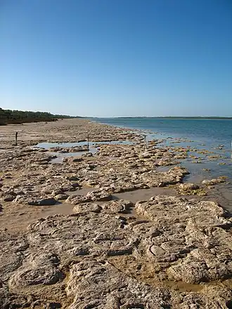 - une variété « pustuleuse » à Entophysalis, la plus souvent exondée par la marée. Ces stromatolithes sont peu ou pas laminés et moins denses, en blocs globalement circulaires d'un mètre de large et de dix centimètres de hauteur. Ils sont essentiellement produits par la bactérie Entophysalis major, qui pourrait descendre d'Entophysalis, ce qui en ferait la lignée vivante directe la plus ancienne connue sur la terre pour un organisme non-fossile.