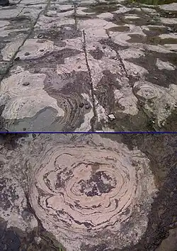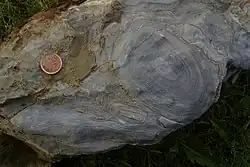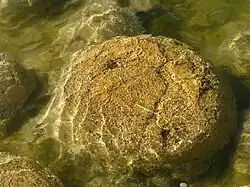 Un stromatolithe[Note 1], ou stromatolite (on parle aussi parfois de « thrombolite »), est une structure laminaire constituée de calcaire, parfois de silice, qui se développe en milieu aquatique peu profond, marin ou d'eau douce continentale[Note 2],[1],[2],[3]. Les stromatolithes sont d'origine à la fois biogénique (biolithogenèse par des communautés de cyanobactéries) et sédimentaire (structures carbonatées en feuillets empilés formés de particules sédimentaires piégées dans des voiles algaires gélatineux produits par ces bactéries).