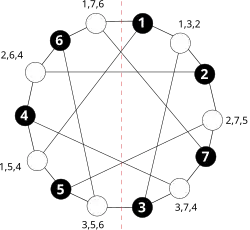 Une structure C isomorphe à sa duale C∗ est appelée auto-duale. Le plan de Fano ci-dessus est une structure d'incidence auto-duale.