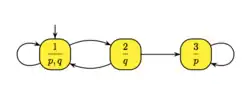 Dans l'exemple ci-contre, l'ensemble de propositions atomiques est . Ici et sont des propriétés booléennes quelconques. L'état 1 contient les deux propositions, les états 2 et 3 respectivement et . L'automate admet le chemin , et le mot est la suite des étiquettes associées. Les suites d'étiquettes acceptées sont décrites par l'expression rationnelle :