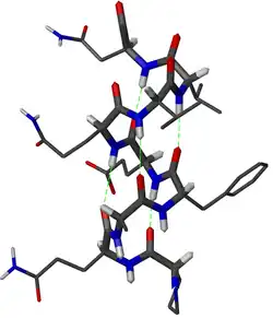 Lorsque les brins β s'organisent de manière tête-bêche, ils forment un feuillet β anti-parallèle. Les groupements -NH et -CO d'un résidu i d'un brin A forment des liaisons hydrogène avec les groupements -CO et -NH d'un résidu j d'un brin B. Typiquement, 2 brins β consécutifs relié par un coude forment un feuillet β anti-parallèle. Un brin β moyen dans un feuillet anti-parallèle mesure 0.68 nm, soit une translation de 0.34 nm par résidu. Les angles dièdres φ et ψ des liaisons peptidiques sont en moyenne de -139.0° et +135.0°.