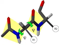 La chaîne principale contient trois liaisons covalentes par acide aminé. La liaison peptidique étant une liaison plane, il reste deux liaisons simples autour desquelles la rotation est possible. On peut donc déterminer la conformation du squelette d'un acide aminé à partir de deux angles dièdres, φ et ψ.