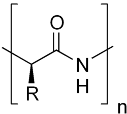 - ↑ la chaîne principale d'une protéine correspond aux atomes impliqués dans la structure de base du polypeptide (-NH-CαH-CO-). Les chaînes latérales des acides aminés (souvent notées -R) n'appartiennent donc pas au squelette carboné.
