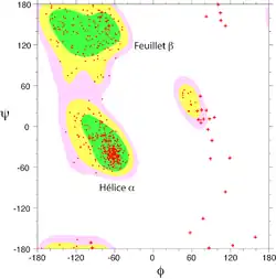 Toutes les valeurs des angles φ et ψ ne sont pas possibles car certaines conduisent à des contacts trop proches entre atomes qui sont énergétiquement très défavorables. Une étude systématique des combinaisons admissibles d'angles φ et ψ a été réalisée par le biologiste et physicien indien Gopalasamudram Narayana Ramachandran en 1963[2]. Il a imaginé une représentation sous forme graphique de l'espace (φ ,ψ) qui porte aujourd'hui le nom de diagramme de Ramachandran. Ce diagramme montre trois principales zones énergétiquement favorables. Lorsqu'on analyse une structure de protéine, on observe que la majeure partie des acides aminés ont des combinaisons d'angles (φ ,ψ) qui s'inscrivent à l'intérieur de ces zones. Les deux principales régions correspondent aux structures secondaires régulières qui sont principalement observées dans les protéines : la région des hélices α et celle des feuillets β. La troisième région, plus petite, correspond à une conformation en hélice gauche (φ>0).