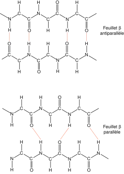 Un feuillet β est bien souvent composé de brins parallèles et anti-parallèles. Les feuillets β peuvent être plats mais ont plutôt tendance à former une structure légèrement gauche.