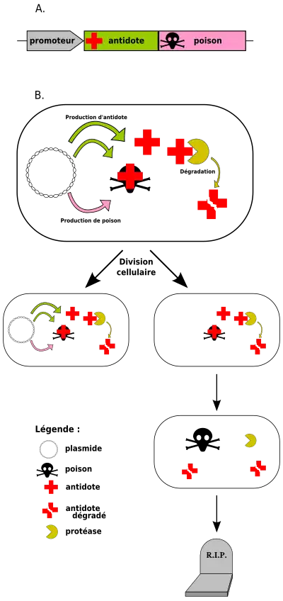 Si, lors de la division cellulaire, une des cellules filles ne reçoit pas de copie du plasmide, l’antidote ne peut plus être synthétisé de novo. Les molécules d’antidote restant dans le cytoplasme sont dégradées par une protéase ATP-dépendante spécifique produite par l’hôte. Le poison est dès lors libéré et tue la cellule. Ce mécanisme est appelé mort post-réplication (post-segregational killing).
