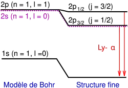 Le modèle prenant en compte les effets relativistes permet donc de corriger cette énergie, de lever partiellement la dégénérescence du niveau d'énergie et de séparer les raies spectrales.
