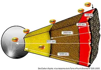 Globalement, la température s'élève avec la proximité au centre de la Terre. À titre indicatif, elle varie entre 1 100 °C à la base de la croûte continentale à probablement 5 100 °C dans le noyau.