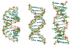 La double hélice d'acide nucléique est un polymère en spirale, généralement dextrogyre, contenant deux brins de nucléotides dont les paires de bases s'apparient entre elles. Un simple tour de l'hélice fait environ 10 nucléotides, et contient un creux majeur et un creux mineur, le majeur étant plus large que le mineur[5]. Compte tenu de cette différence, de nombreuses protéines qui se lient à l'ADN le font au niveau du creux majeur[6]. Plusieurs formes de double hélice sont possibles ; pour l'ADN, les trois formes biologiquement pertinentes sont l'ADN A, l'ADN B et l'ADN Z, alors que les doubles hélices d'ARN ont des structures similaires à la forme A de l'ADN.