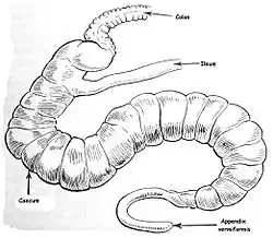 Pendant longtemps dans les manuels d’anatomie humaine, l'appendice humain décrit comme un diverticule du cæcum, était considéré comme une structure vestigiale non fonctionnelle : sa fonction originale (digestion des substances végétales crues chez les herbivores) aurait été perdue depuis longtemps. Des observations plus précises ont cependant mis en évidence que l'appendice possède le biofilm le plus dense du système digestif qui abriterait une flore bactérienne commensale qui servirait de réserve au cas où une grave indigestion et la diarrhée qu’elle provoque évacueraient le biofilm intestinal, éliminant les bactéries bénéfiques au profit des bactéries pathogènes[5].