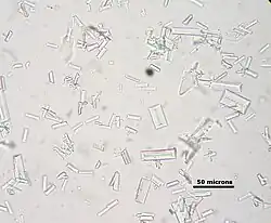 Cristaux de struvite dans une urine humaine de pH 9. On observe aussi de nombreux cristaux xénomorphes, plusieurs cellules épithéliales (squameuses et non squameuses) et quelques leucocytes.