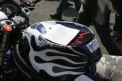 - Réservoir : le plus souvent aplati et muni de divers matériaux adhérents (grip de surf, de skate, chambre à air), afin de pouvoir s'asseoir dessus lors de tricks tels le fenwick (les deux jambes par-dessus le guidon).