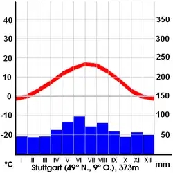 Le climat de Stuttgart étant de type semi-continental, cela se traduit par des hivers pouvant être rudes et le thermomètre tourne autour de 0 °C. Les étés sont relativement chauds avec une température légèrement inférieure à 20 °C.